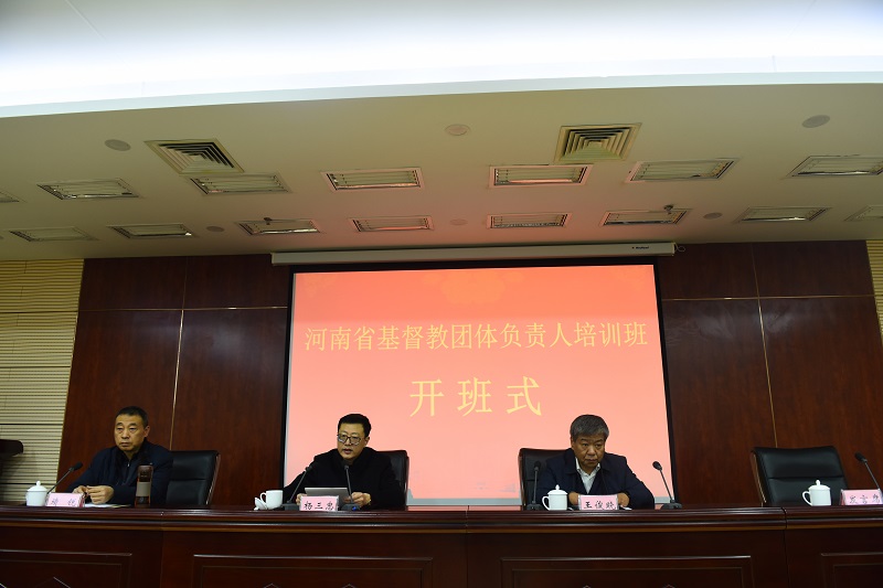 2019年1月7日,河南省基督教团体负责人培训班在河南省社会主义学院开班,省社院副院长、党组成员王俊晓,省民宗委副主任杨三忠出席开班式,省民宗委宗教二处处长靖锐主持开班式。本次培训是对习近平新时代中国特色社会主义思想和党的十九大精神的再学习再教育,是深入贯彻全国宗教工作会议精神,学习新修订的《宗教事物条例》等宗教政策法规,积极引导基督教与社会主义社会相适应的具体举措,来自全省各地基督教两会的负责人共154人参加培训。