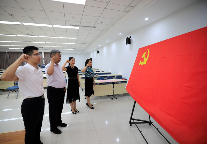 教研室党支部全体党员面对庄严的党旗,握拳宣誓,重温入党誓词。铿锵恢宏的誓词时刻提醒着每位党员所肩负的神圣使命和责任。