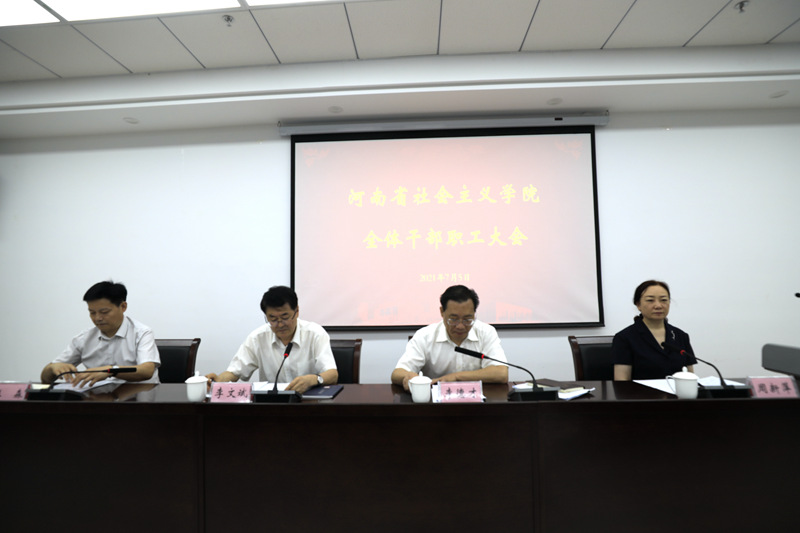 7月5日上午,河南省社会主义学院召开全体干部职工大会,宣布河南省委关于任命周新萍同志为河南省社会主义学院院长的决定。省委统战部副部长、省社会主义学院党组书记、常务副院长李文斌主持会议,省委统战部常务副部长李德才出席会议并讲话,省委组织部干部三处处长王森宣读省委决定,周新萍作表态发言。省社会主义学院领导班子成员、全体干部职工参加会议。