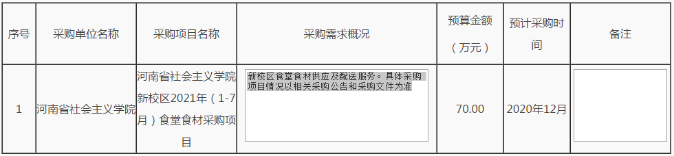 为便于供应商及时了解政府采购信息,根据《河南省财政厅关于开展政府采购意向公开工作的通知》(豫财购【2020】8号)等有关规定,现将河南省社会主义学院 2020年11(至)12月采购意向公开如下: